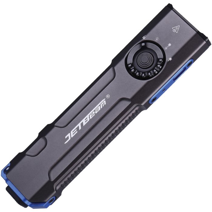 Dimensions: 5.13" x 1.25". Strobe. Water resistant. Impact resistant. Rechargeable. Lanyard. 3-in-1 design. Green laser, EDC flashlight. Light source selector dial. USB-C charging. Anti-slip grip. Memory function. Modes: Turbo (2000 lumens, 1.6h runtime); High (700 lumens, 1.7h runtime); Medium (300 lumens, 3.5h runtime); Low (15 lumens, 65h runtime); Green laser (5mw, 15h runtime). 165m beam distance. Requires (1) Lithium battery (included). Aluminum construction.